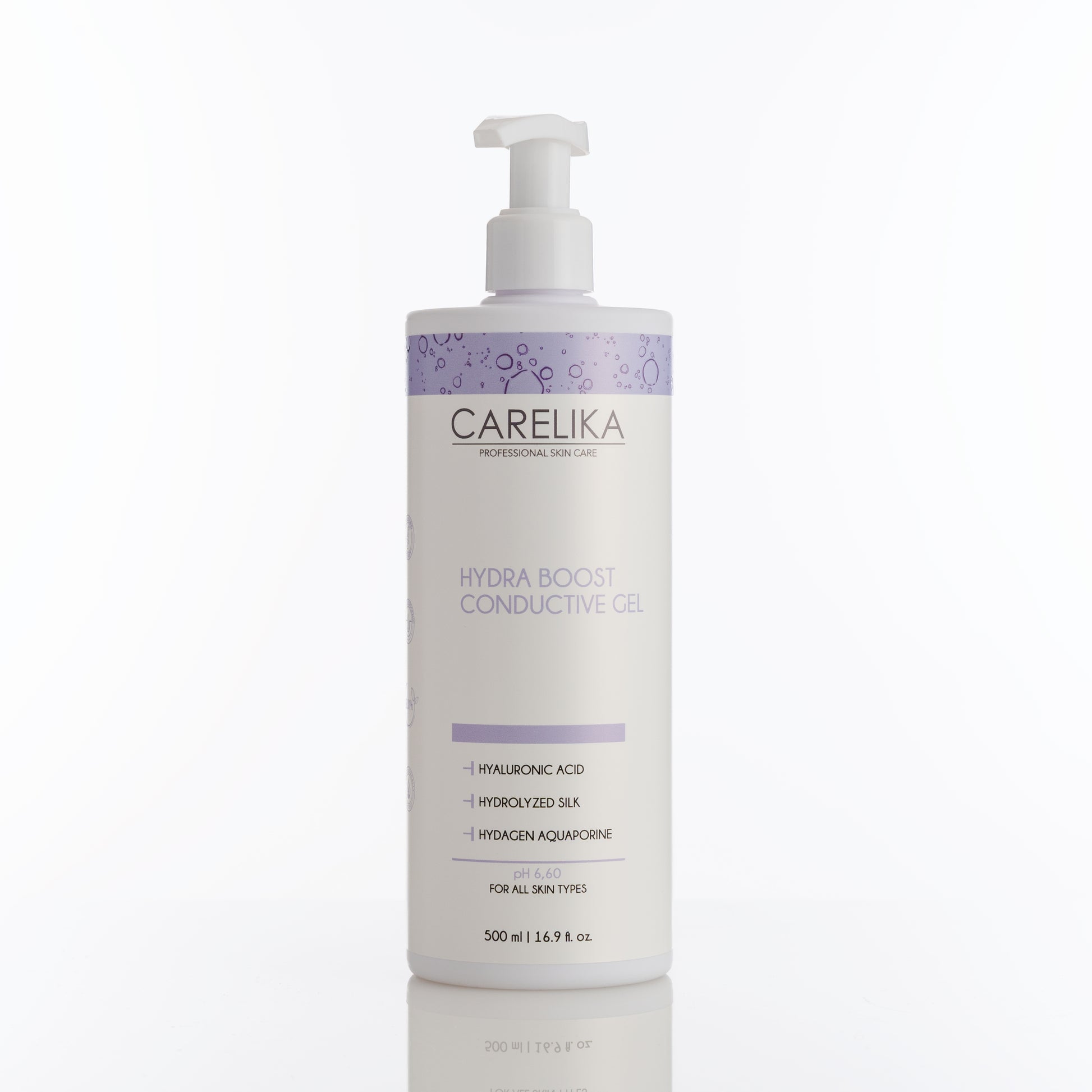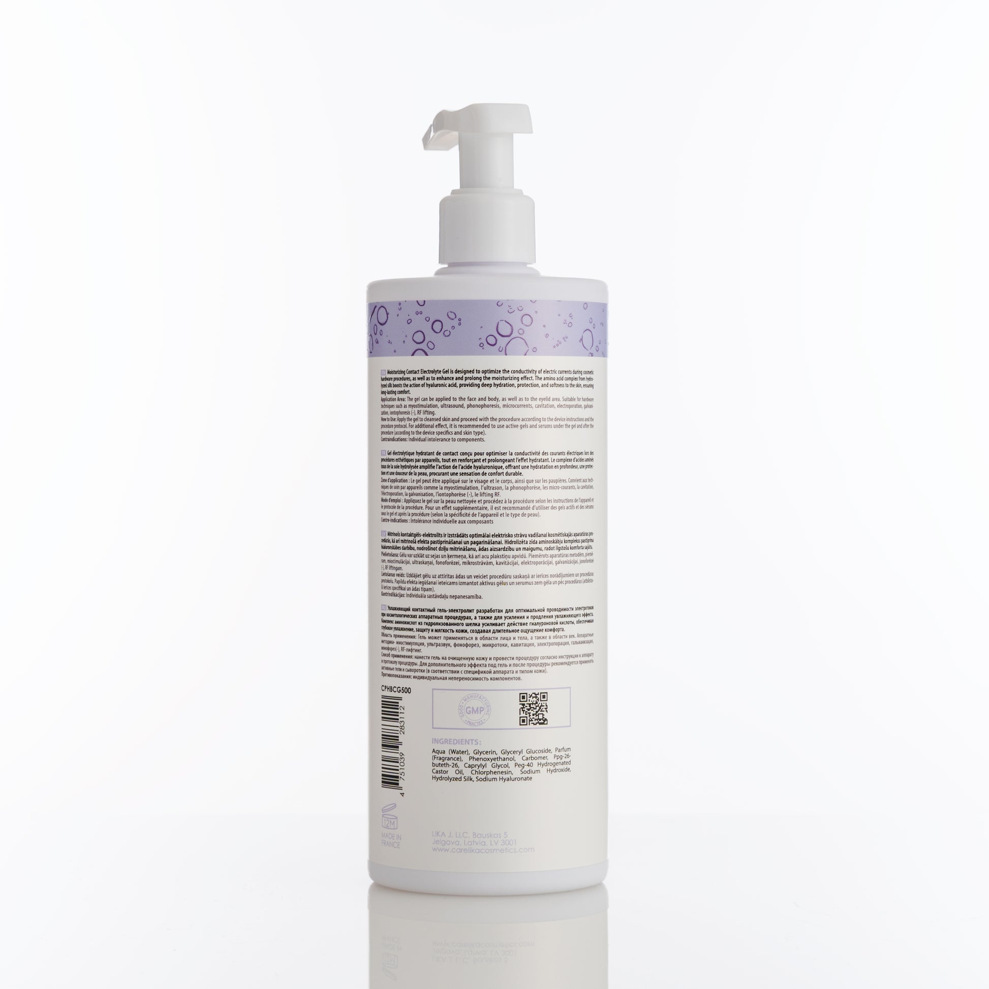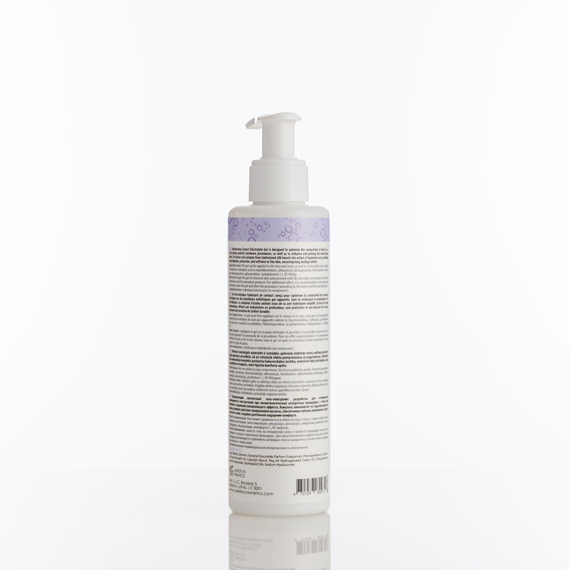 Moisturizing contact electrolyte gel designed to optimize the conductivity of electric currents during professional beauty device procedures. Enriched with a hydrolyzed silk amino acid complex, hyaluronic acid, and Hydagen Aquaporine, it deeply hydrates, protects, and softens the skin, ensuring long-lasting comfort and smoothness.